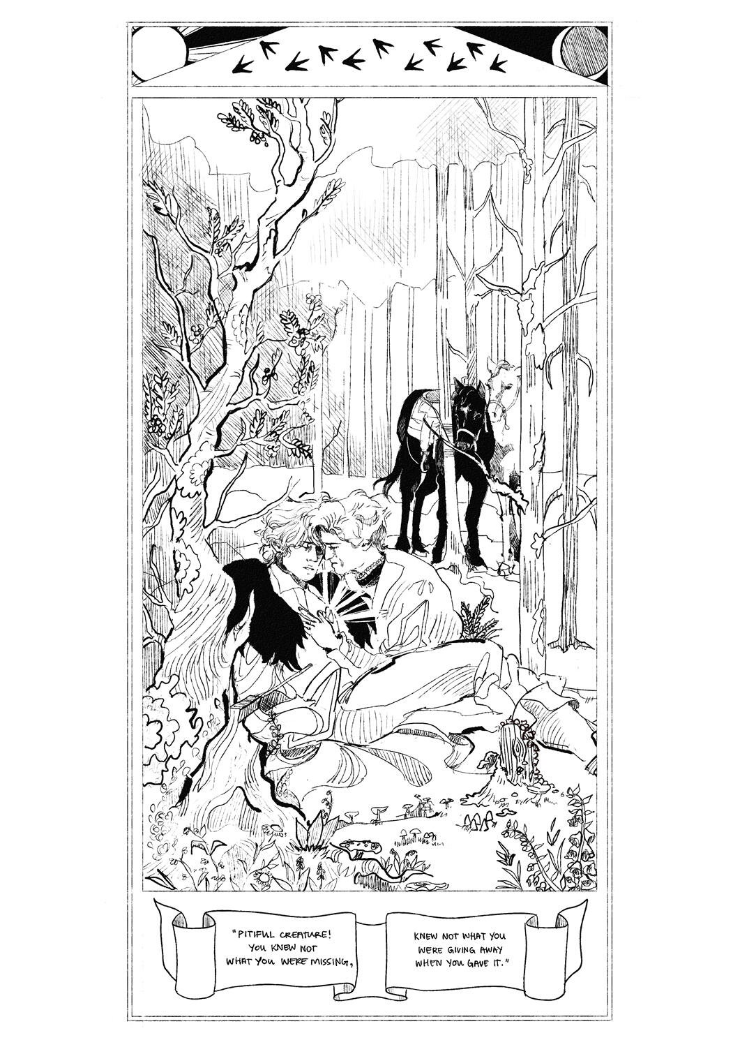 beneath Winter’s Shroud is a long-form webcomic set in the wilderness of Orkideya Ridge, where a traveling schoolmaster and a reclusive huntsman become entangled in a web of suspicion, folklore, and supernatural horrors after a series of brutal wolf attacks plague a snowbound village.